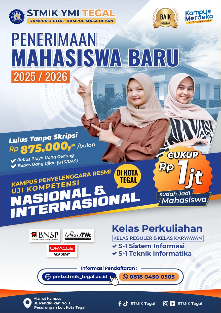 STMIK Tegal, Jl. Pendidikan No. 1 Tegal Pendaftaran Mahasiswa Baru 2025/2026 Kuliah sambil bekerja Bekerja sambil kuliah ✅ Kelas Reguler sore/malam ✅ Karyawan ✅ kelas full online ✅ 2 ½ tahun kuliah di kampus ✅ 1 ½ tahun PKL & hasil aplikasi di tempat kerja ✅ Lulus tanpa skripsi ✅ Keterangan & informasi pendaftaran 081840500505...Read More